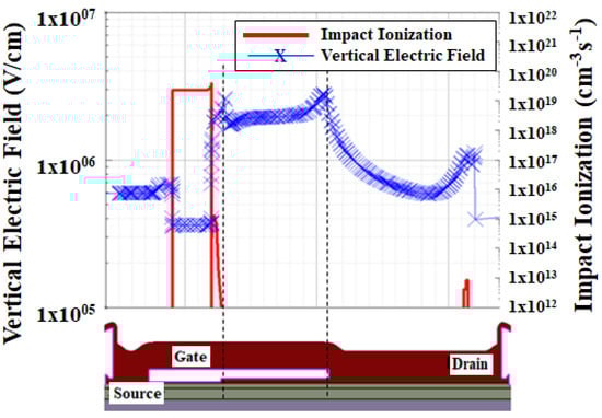 Simulated Impact ionization and vertical electric field distribution along the X-axis at 2DEG region in GaN HEMT device.