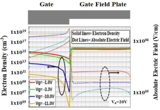 Figure 12 explains the mechanisms of source-drain current modulation. More negative gate voltage will repel the 2DEG under the gate and the other possible mechanism is the weakened piezoelectric effect which induces less 2DEG concentration [58,59,60]. The cutline is drawn horizontally along the X axis in the AlGaN barrier layer. From the simulation, the critical region during negative gate bias can be found in the gate edge at the drain side. This spot shows a relatively high vertical peak electric field. The high electric field at the gate edge has been reported to be one of the factors that causing current collapse. The source to drain current is modulated by the applied gate voltage.
