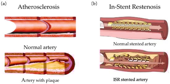 Atherosclerosis of blood vessels and in-stents restenosis: (a) Atherosclerosis [1]; (b) ISR [7].