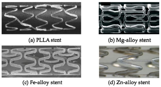 BDSs: (a) PLLA stent [52]; (b) Mg-allot stent [53]; (c) Fe-alloy stent [54]; (d) Zn-alloy stent [55].