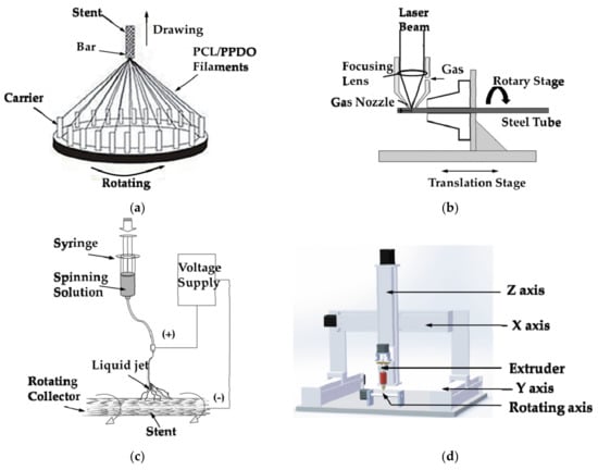 As the precise medical device, the manufacturing methods of vascular stents mainly include braided method (Figure 7a) [75,76,77,78], laser cutting method (Figure 7b) [79,80,81,82], electrospinning technology (Figure 7c) [83,84,85,86] and additive manufacturing technology (Figure 7d) [87,88,89,90,91]. The braided method is to first wind the wire on the carrier. There are multiple carriers in Figure 6A, whose purpose is to use the two kinds of filaments to fabricate the stent at the same time. Draw the cylindrical bar upwards and rotate carriers at the same time, so that the filaments are wound around the bar, thereby forming a mesh-like braided structure stent. As the stent structure tends to become more complicated, the vascular stent manufactured by the braided method is limited to a simple structure, and the stent has poor radial stiffness, so the braided method is no longer suitable for fabricating stent.