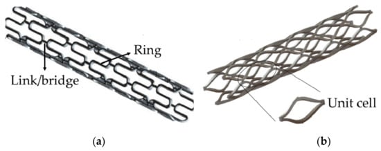 Two types of vascular stent designs: (a) Link/bridge stent [86]; (b) RVE/RUC stent [96].