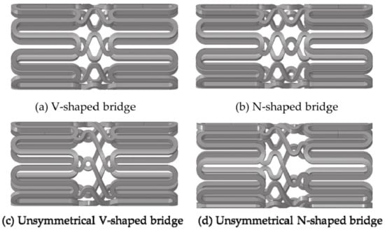 Different bridge structures [92]: (a) V-shaped; (b) N-shaped; (c) Unsymmetrical V-shaped; (d) Unsymmetrical N-shaped.
