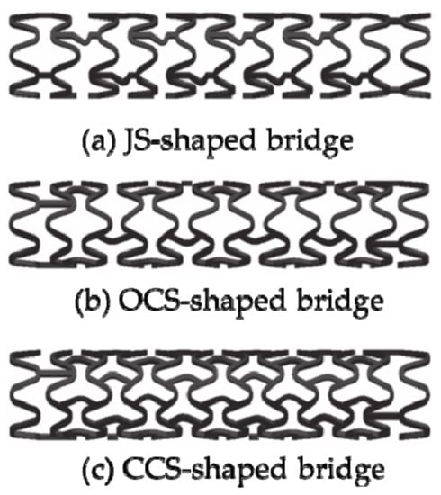Wei et al. [102,103] designed the JS-shaped bridge, the OCS-shaped bridge, and the CCS-shaped bridge (as shown in Figure 10), and used the plane compression method, the V-groove compression method, and the three-point bending method to study the mechanical properties of stents. The experimental results showed that the radial strength of the JS-shaped stent, the open OCS-shaped stent, and the closed CCS-shaped stent was 14%, 34%, and 42% higher than the radial strength of the ordinary biodegradable stent structure, respectively. The bending stiffness of the JS-shaped and OCS-shaped was equivalent to that of the ordinary biodegradable stent structure, which was reduced by about 73% compared with the CCS-shaped. All stents had no axial foreshortening. Although the radial stiffness has been improved, they do not take into account the radial stiffness and axial flexibility performance when designing stents with various bridges. For the study of the axial flexibility of vascular stents, Mori and Saito [104] analyzed the influence of four different structures, W-shaped, S-shaped, WD-shaped, and N-shaped on the compliance performance of stents (as shown in Figure 11). They used the four-point bending test method to test the bending stiffness of the stents and found that the S-shaped stent was 85.28 N mm2, the N-shaped stent was 41.67 N mm2, and the improved WD-shaped stent was 78.79 N mm2, W-shaped stent was 188.67 N mm2, respectively. This test provides a new method for studying the axial compliance and flexibility of vascular stents, namely the four-point bending test. Similarly, these studies have not balanced the radial stiffness and axial compliance, and they are all based on a single factor to design the bridge to improve the structure of the stent.