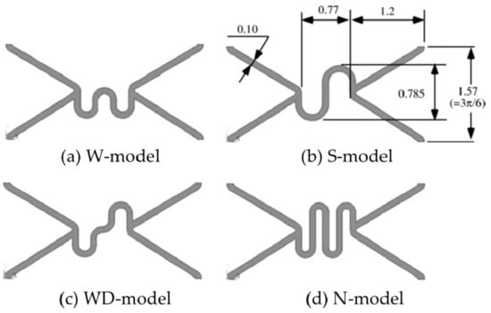 The link/bridge is one of the important factors affecting the axial flexibility of the stent [84]. Regarding the design of the “bridge” vascular stent, the researchers pointed out that the geometric parameters of the link/bridge determined the mechanical properties of the stents [92,94,97,98,99,100]. At present, the bridges of vascular stents roughly include L-shaped, N-shaped, V-shaped, S-shaped, etc. In the analysis of the mechanical properties of the vascular stents with L-shaped, V-shaped, and S-shaped, Behrend used the cantilever method to verify that the RX Multilink stent with an L-shaped bridge had the smallest axial stiffness [99]. However, due to not involved the S-shaped stent in the experiments, and the number of experimental samples was too small, the conclusion cannot be used as an evaluation standard for different bridge stents. Ormiston et al. [100] used the three-point support method to study vascular stents with a variety of bridge structures. The results showed that the performance of the S-shaped vascular stent was better than that of the L-shaped and V-shaped stents, and the axial flexibility of the L-shaped and V-shaped stents was almost the same. Similarly, Wei et al. [101] pointed out that among the six different stent structures, when the vascular curvature was 0° and 15°, the stent with an S-shaped bridge structure was the most flexible. When the vascular curvature was 30°, 45°, and 60°, the U-shaped stent had the best flexibility. However, these studies are based on the finite element simulation of the ideal model analysis, and do not simulate the effect of balloon dilatation on the structure and ignore the role of intravascular plaque. Azaouzi et al. [92] separately studied the effects of V-shaped, N-shaped, unsymmetrical V-shaped, and unsymmetrical N-shaped on the mechanical properties of balloon-expandable stents (as shown in Figure 9) and conducted finite element analysis on the axial flexibility and radial strength of stents with different bridge shapes. The results showed that in terms of bending performance, the symmetrical N-shaped bridge and unsymmetrical V-shaped bridge had better flexibility. In terms of torsional performance, symmetrical V-shaped bridge stent had the worst flexibility, and unsymmetrical N-shaped stent had the best flexibility. Since the radial force and stress of the symmetrical N-shaped bridge structure are small, it is the structure with the best radial support performance in all stents. However, the Azaouzi team do not make a quantitative analysis of the stent structures and did not directly give the radial elastic recoil rate and axial foreshortening rate of different bridge stents, but only limited to a qualitative evaluation of the structure.
