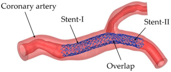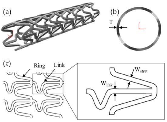 Atherosclerosis is one of the cardiovascular diseases. Its pathological mechanism is that fat or lipid substances are deposited on the arterial wall under the influence of various cardiovascular risk factors. These depositions form a large number of plaques, leading to arterial wall thickening, causing a vascular blockage, and affecting blood flowing (as shown in Figure 1a [1]). Severe atherosclerosis can also cause coronary artery disease, stroke, peripheral artery disease, or kidney problems. At present, the most common and effective treatment method in the world is Percutaneous Coronary Intervention (PCI) [2,3]. PCI is to unblock and restore blood by placing a vascular stent on the stenosis and hardening of the artery for expansion. PCI is minimally invasive and highly effective. In the treatment of PCI, the stent is a tiny tubular structure and used to expand the vessel wall and expand the vascular lumen to prevent the artery wall from recoiling and restore the cardiovascular obstructed by atherosclerosis [4,5]. Therefore, the vascular stent, as the sophisticated medical device for clinical treatment, should have ideal functions and mechanical properties [6]: (1) high elasticity to realize the curling and re-expansion of the stent in the blood vessel; (2) high strength and fatigue resistance to withstand the periodic physiological load of arteries; (3) good biocompatibility to reduce the incidence of thrombosis and vascular restenosis and alleviate implant rejection in the body. In addition, there are other properties. In addition to these features mentioned, 13 different properties of ideal stent were listed in the review article of Liu et al. [7], which provides a great help for the design of vascular stents. And Liu et al. also pointed out that there were no perfect stents. The current clinical application of vascular stents, after decades of development, has the corresponding therapeutic function and mechanical properties. Manufacturing technology and surgical technology are gradually becoming mature. What’s more, the arterial blockage after interventional therapy has been significantly reduced. However, each stent still has its own advantages and drawbacks inevitably. A stent cannot cover all ideal properties, and usually offers several good properties. The design structure of stent is related to restenosis. There are still many complications in the current PCI treatment. Among them, In-Stent Restenosis (ISR) is the most common complication (as shown in Figure 1b [8]), which is an important challenge for biomechanical engineering, and has an impact on designing stent. Studies have shown that one year after the implantation of ordinary metal stents, the probability of restenosis at the diseased blood vessel is as high as 20–40% [9], and about 10% of patients need to re-implant the stent. Even for the drug-eluting stent, which has been widely used in recent years, the restenosis rate in the stent after implantation is as high as 8–15% [10,11].