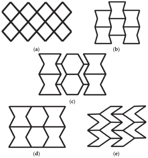 RVE structure of vascular stent [96]: (a) Diamond; (b) Reentrant Auxetic; (c) Hybrid A; (d) Hybrid C; (e) Chevron B.