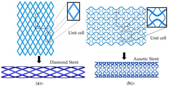 Two-unit cell of stents [110]: (a) Diamond stent; (b) Auxetic stent.
