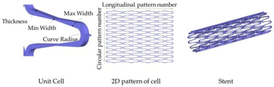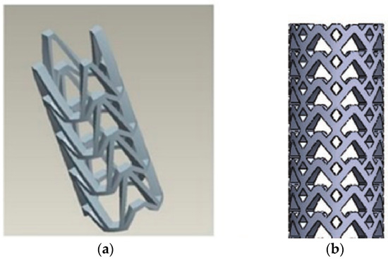 In the structural design of vascular stents, the representative volume element (RVE)/representative unit cell (RUC) is often studied [107,108]. By designing the unit cell and analyzing its performance, the design efficiency is improved, and the diversification of the stent structure can be realized. The Prithipaul team [96] designed vascular stents with different RVE structures (as shown in Figure 13) and compared the mechanical properties. They carried out an experimental analysis of mechanical properties from the radial elastic recoil, foreshortening, radial stiffness, and Wall Shear Stress (WSS). They deemed that except the Diamond structure exhibiting poor mechanical properties, Reentrant Auxetic, Hybrid A, Hybrid C, and Chevron B exhibited better radial stiffness, foreshortening respectively. Each structure cannot have the advantages of multiple mechanical properties. For example, the radial stiffness and WSS of the Diamond stent were contradictory. Douglas et al. [109] also studied five-unit structures of vascular stents Diamond, Reentrant Auxetic, Hybrid A, Hybrid C, and Chevron B, and their conclusions were consistent with Prithipaul et al. In addition, Dolla et al. [110] and Tan et al. [111] both verified the conclusion that the Reentrant-Auxetic stent had good mechanical properties. Figure 14 is two vascular stents with different unit cells designed by Dolla et al. [110].