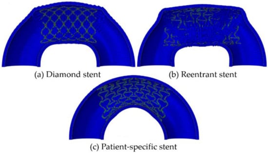FEA results of four different stent-vessel systems after expansion [124]: (a) Diamond stent; (b) Reentrant stent; (c) Patient-specific stent.