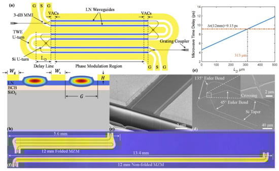 (a) Schematic of the folded Si/LN MZM. (b) Cross-sectional view of the phase shifter. (c) Scanning electron microscopy (SEM) image of the cross-section of the phase modulation region. (d) SEM image of the Si U-turn waveguides and crossing. (e) Microwave time delay as a function of the length of delay line (LD). (f) Optical image of the 12 mm folded and unfolded MZMs, the actual device lengths including coupling regions (≈200 μm per side) are 5.6 mm and 13.4 mm, respectively.