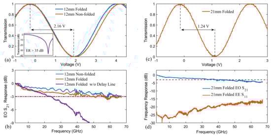 (a) Normalized optical transmissions of 12 mm folded and non-folded MZMs as a function of the applied voltage, showing Vπ of 2.16 V and 2.25 V, respectively. The inset shows the measured normalized transmission on a logarithmic scale. (b) Measured EO S21 responses of 12 mm non-folded MZM, 12 mm folded MZM, and 12 mm folded MZM without microwave delay line. (c) Normalized optical transmission of 21 mm folded MZM as a function of the applied voltage, showing Vπ of 1.24 V. (d) Measured EO S21 and RF S11 response of 21 mm folded MZM.