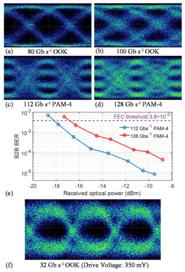The high-speed modulation ability of the modulator has also been characterized. First, we use the 12 mm device to demonstrate high-speed data modulation. Figure 3a,b show the optical eye diagrams for OOK modulation at 80 Gb s−1 and 100 Gb s−1. The measured extinction ratios are 7.8 and 5.8 dB, respectively. We also performed the PAM-4 modulation experiments at 56 Gbaud (112 Gb s−1) and 64 Gbaud (128 Gb s−1); the results are shown in Figure 3c,d. Figure 3e shows the back to back (B2B) bit-error rate (BER) versus the received optical power for 112 Gb s−1 and 128 Gb s−1 PAM-4 signal transmission. The details of the B2B BER measurements can be found in our previous work [20]. In addition to the data rate difference, the 1.5 dB power penalty between the 56 Gbaud and 64 Gbaud is partly due to the bandwidth constraint of the oscilloscope. Furthermore, we employ a CMOS digital-to-analog converter (DAC) circuit to generate 32 Gbps electrical OOK signals with peak-to-peak voltage of 350 mV, which was used to directly drive the fabricated low-Vπ modulator with the total modulation length of 21 mm. Figure 3f shows the optical eye diagram with measured extinction ratio of 2.7 dB. We also performed higher data rate experiments up to 112 Gb s−1 with an RF amplifier on this device; the results can be found in the Supplementary Materials, Section S4.