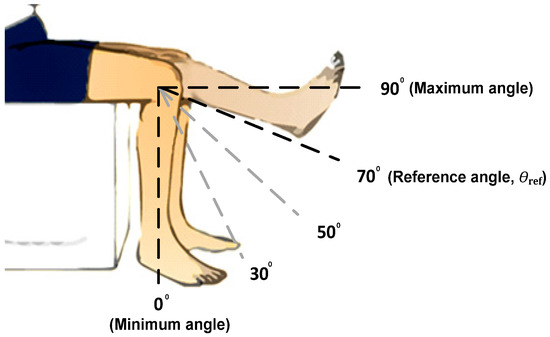 The angle in Figure 2 shows the estimated knee movement of an SCI patient using the closed-loop FES device. In rest mode, the knee angle is at 0° and remains at this angle until a stimulus charge is applied to the quadriceps muscles by the FES device. The injected stimulus charge will contract the muscle, which consequently results in knee extension movement. The actual angle (θact) produced by the limb’s movement will be used as a feedback input to the FLC to determine the required amount of charge that needs to be adjusted during the stimulation operation. As illustrated in Figure 2, the example of the target angle (θref) is set at 70°. The difference between θref and θact is known as an Error (E), while the difference between current and previous errors is known as a Change in Error (dE). The Error (E) and Change in Error (dE) can be defined by the following equations:
