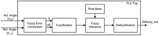 The actual angle was then converted into Error (E) and Change in Error (dE). The Error (E) and Change in Error (dE) were connected to the input of FLC. In this research work, the FLC structure was developed using the Sugeno style, in which the output membership functions (MFs) of the fuzzy are singletons. The Sugeno method was chosen due to its simplicity, compactness, being computationally more efficient and easier to implement on digital hardware [54,56]. Details of each FLC design block implementation are explained in the following sub-sections.