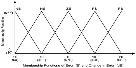 In this project, triangular MFs were used for the two inputs of Error (E) and Change in Error (dE). Symmetrical triangular shapes were used throughout this application because of their simple calculation, linear characteristics, proper intersection between each fuzzy set, small steady-state error and efficiency of implementation in Verilog HDL [8]. Figure 5 illustrates how triangular input membership functions were formed for Error (E) and Change in Error (dE) in the fuzzification process using a trial-and-error method. For each input of Error (E) and Change in Error (dE), five triangular MFs were used, which included Positive Big (PB), Positive Small (PS), Zero (ZE), Negative Small (NS) and Negative Big (NB). In this work, both Error (E) and Change in Error (dE) were designed to have similar MFs in the range of −20 to 20. The detailed ranges of values for the above-mentioned MFs are listed in Table 1. The values of the x and y axes for all MFs were scaled into 8-bit digital values from 0 ($00) to 255 ($FF) for digital implementation in the FPGA, as depicted in Figure 5 and listed in Table 1 (“$” indicates hexadecimal value).