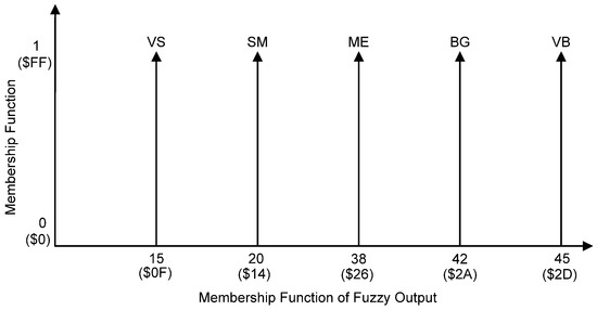 Finally, the defuzzy output was calculated using the centre of gravity (COG) method. The COG method has the advantage of reducing computational complexity and producing a fast output [56]. This COG method was implemented by multiplying the fuzzy output from the rules’ evaluation with its corresponding singleton value, then dividing the sum of this value by the sum of all fuzzy outputs from the rules’ evaluation, as shown in Equation (12).