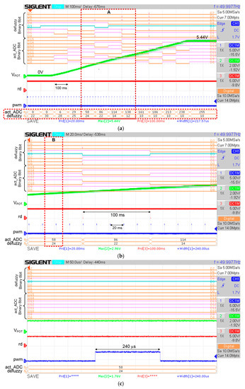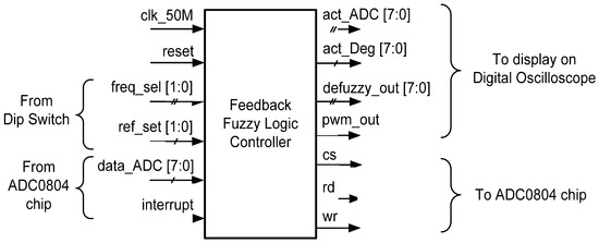 Some of the FFC signals, such as the acquired ADC data (“act_ADC [7:0]”), the converted ADC angle data into degrees (“act_Deg [7:0]”), the defuzzy output (“defuzzy_out [7:0]”) and the pulse width signal (“pwm_out”), were set as output to observe the designed FFC functionality on a digital oscilloscope.
