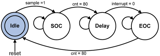 The digitized sensor data (“ADC_data [7:0]”) from the ADC circuit are acquired by the ADC Data Acquisition sub-module every 100 ms using the interface control signals (“cs”, “rd”, “wr” and “interrupt”) to communicate with the ADC (ADC0804) chip. Figure 9 illustrates the state diagram of the finite state machine (FSM) for the ADC data acquisition process.
