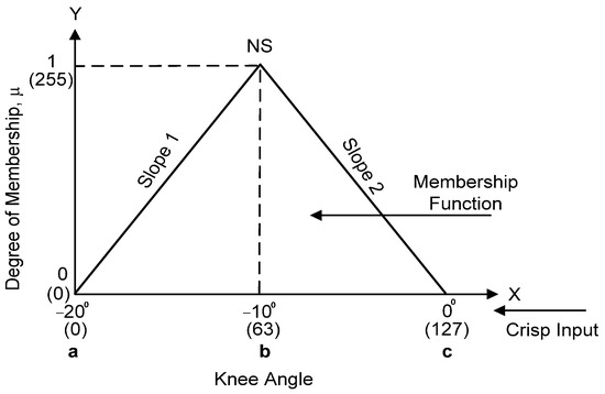 In this design, the clock frequency of 50 MHz from the FPGA (DE2-115) board was used as a master clock input. The master clock at 50 MHz (“clk_50M”) was down-converted into a 1 MHz clock (“clk_1M”) for the usage of ADC Data Acquisition, Fuzzy Error Conversion and PWM sub-modules. After the system is powered on and reset, the digital FFC begins tracking knee angle movement by acquiring the actual knee angle data from the ADC circuit every 100 ms. Right after the ADC data are acquired, the FLC sub-module is triggered to process the acquired feedback data and produce the required pulse width data (“pulse_out [15:0]”) for the PWM sub-module. The stimulus pulses are then delivered at frequencies ranging from 20–50 Hz. The following sub-sections explain the operation of the FFC, beginning with ADC data acquisition and progressing to fuzzy error conversion, fuzzification, rule base inference, defuzzification, and finally pulse width signal generation.