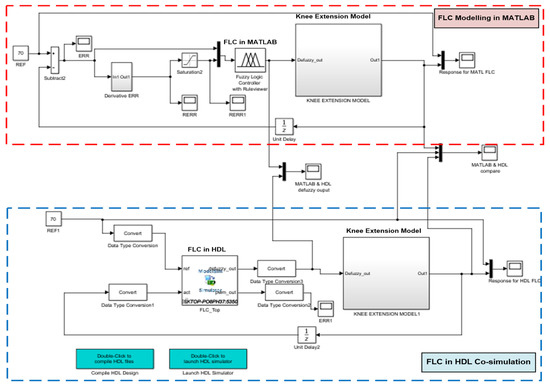 Figure 18 depicts the HDL co-simulation results of the designed digital FLC (in HDL) and the modelled FLC (in MATLAB (Mathworks, Portola Valley, CA, USA)) using knee angle trajectory and defuzzy output responses for system level verification in the MATLAB Simulink environment. Both types of FLC controllers were employed in the closed-loop FES system with the knee extension model as a plant and tested at three different target angles (70°, 40° and 30°). Figure 18a depicts knee trajectory and defuzzy output responses for a target angle of 70°, Figure 18b depicts knee trajectory and defuzzy output responses for a target angle of 40° and Figure 18c depicts knee trajectory and defuzzy output responses for a target angle of 30°. From all the simulation results obtained (for three different target angles), it is observed that the modelled FLC and designed digital FLC are able to meet the target angle by using the optimized singleton MF settings. The knee trajectory and defuzzy output responses for the digital FLC are almost the same as for the modelled FLC, with an average percentage of error of 2.22% only.