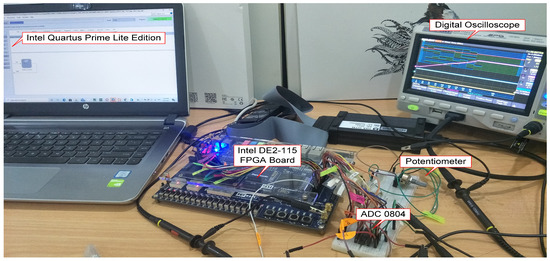 The digital FFC was designed using hardware description language (HDL) Verilog codes and implemented on the Intel’s FPGA (DE2-115) board. Figure 7 depicts the FFC top level.
