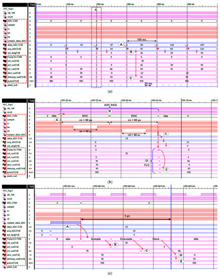It is important to note that, besides converting the acquired ADC data into Error (“err_cur [7:0]”) and Change in Error (“derr_cur [7:0]”) using the FSM, the Fuzzy Error Conversion sub-module indirectly controls and determines the duration of the FLC sub-module mathematical operation as a whole. This is because the other sub-modules, such as Reference Setting, Fuzzification, Fuzzy Inference (Rule Base) and Defuzzification, consist of combinational logic gates, which directly execute the mathematical operations in parallel once the input data are made available. Therefore, in this FLC design, the FSM of the Fuzzy Error Conversion sub-module requires only three clock cycles (from state Sample to state Store) to produce the defuzzy and pulse width output values as depicted in Figure 10.