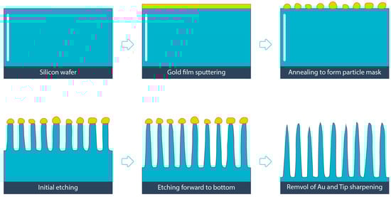 The involved fabrication processes are schematically illustrated in Figure 1. Firstly, polished (100)-oriented p-type silicon wafers with a resistivity of 1–20 Ω·cm and thickness of 500 ± 10 µm were selected to fabricate the silicon nanowires. Next, all wafers were cleaned using a buffered oxide etch (BOE) solution at room temperature, followed by acetone, isopropanol, and deionized water (DI water) rinsing to remove the native oxide, residuals, and organic contamination. Next, gold thin films with various thicknesses of 4, 6, 8, and 10 nm were deposited on the wafer surface by employing the magnetron sputtering technique at room temperature (DC sputtering system, AJA International, Scituate, MA, USA). Next, the Au NPs-based masks were created by applying a rapid thermal annealing step at 500 °C for one hour. The Au NPs size presents a strong dependence on the film thickness. Subsequently, the silicon wafer was DRIE-etched with a modified Bosch process to create the nanowires. The etching process was conducted within an RIE cluster reactor (Plasma Pro100 Cluster, Oxford Instruments, Abingdon, UK).