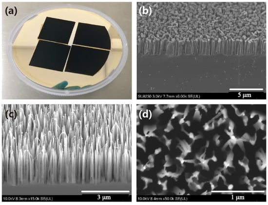 Figure 2a divulges the digital photo of the samples with nanowires formed by applying 120 Bosch etching loops. The NPs were created by enforcing an annealing step on a 4 nm Au thick film and served the role of the etching mask. The sample surface exhibits a black visual due to the nanowires’ “light trapping” ability [26,27]. This ability originates from the energy decay in the surface light reflections and the optical path length extension through the internal refraction and transmission processes [26,28]. The surface reflection loss stems from both the mirror reflection effect at the smooth substrate and diffusion reflection caused by structures with small aspect ratios. As a result, the employment of surface textures with a configuration of the pore, tip, and deep holes can effectively suppress such reflection losses by permitting more incident light to enter the structure and multi-reflect along the depth direction. As far as the optical path length is concerned, it is significantly larger than the actual substrate thickness. More specifically, it is defined as the distance that an unabsorbed photon could travel within the silicon bulk before it escapes, which implies that light waves will have more opportunities to achieve a coupling decay with silicon [29]. The employment of a structure that induces multiple internal reflections, light refraction, and transmission effects can facilitate such a coupling decay process [30]. As a result, surface structures with a smaller smooth area on top and larger aspect ratios can trap an enhanced incident light, leading to constant attenuation through the consecutive interactions of light and silicon within the structure. Figure 2b illustrates the tilted SEM image of the fabricated nanowire array, showing that the Au NPs are distributed uniformly at the top of the nanowires. It is also indicated that the etching step’s depth direction has a high selection ratio between silicon and mask. In addition, the employed etching process is highly anisotropic, which is desired to avoid mask undercut and create structures with elevated aspect ratios. As depicted in Figure 2c, the fabricated nanowires with a height of ~3 μm exhibit a needle-like configuration and have average aspect ratios of about 10:1. Figure 2d divulges the top view image of the silicon nanowires, which indicates a large pore proportion that allows a relatively considerable amount of light to enter and a tiny flat surface proportion on the top to avoid the specular reflection loss of the incident light. In addition, Figure S1 illustrated the digital photographs of a 4 inch wafer of the silicon nanowires formed through 120 etching loops, indicating a good uniformity across the wafer. Table S1 illustrates the etch rate, scallop height, and profile control ability in detail. Figure S2 shows the SEM image at high magnification, which indicates that the sidewalls are smooth and the Bosch scallops have an average height of ~25 nm.