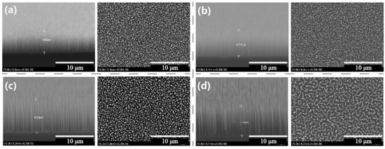 To investigate the impact of the mask size and the duration of the etching process on the silicon nanowire formation, we closely examined the modifications induced by adjusting one etching loop or by employing three different particle sizes. First, Figure S3 illustrates the SEM images of the nanoparticle mask formation before the etching treatment. The Au film with deposition thickness of 4 nm was used, and it presents as continuous islands with spacings. Then, two temperatures of thermal annealing treatment were applied to compare the particle mask formation. It is indicated that the nanowire pitch size mainly depends on the spacing between the isolated particles caused by film thickness and annealing temperature. The nanowires’ diameters rely on the randomly formed particles’ sizes. Figure 3 illustrates the SEM images of the silicon nanowires formed, enforcing longer etching durations and varying the Au nanoparticle sizes. More specifically, Figure 3a reveals the tilted view and top view images of the nanowire structure formed by applying 160 etching loops and the deposition of a 4 nm thick Au film to create the particle mask. The acquired nanowires exhibited an average height of about 5.62 um, indicating that a longer etching duration produces nanowires with higher heights. Besides, Figure 3b–d illustrates the tilted and top views images of the silicon nanowires that are etched through the incorporation of particle masks formed by employing 6, 8, and 10 nm thick Au films, respectively. The obtained average nanowire heights are 6.71, 8.83, and 7.78 μm, respectively. The surface density decreases by increasing the particle size, whereas the silicon nanowire formed by 4 nm thick Au film exhibits the highest density. Since a thicker film is more likely to lead to larger NPs, the inter-particle intervals become larger as well. This effect is nicely captured in Figure 3d. Figure S4 illustrates the SEM images at high magnification of the nanowires formed through 160 etching loops; the particle masks are formed by 4, 6, 8, and 10 nm Au film, respectively. It is indicated that the silicon nanowire formed by 4 nm Au film has the highest structure density. The digital images of the nanowire-based samples are presented by employing four different particle masks formed by the deposition of 4, 6, 8, and 10 nm thick Au film. The nanowire surface induced by the presence of 4 nm thick Au film exhibits the darkest appearance, which is obvious through the digital photograph comparison illustrated in Figure S5. Thus, these silicon nanowires were selected for the following test of the optical character.