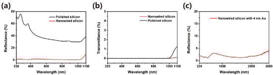 The optical measurements were carried out to investigate the nanowires’ ability to suppress the light reflection. Firstly, a polished silicon wafer was selected as a reference sample for the reflectance and transmittance spectra. Figure 4a demonstrates that the reflectance of the nanowire surface is significantly lower than that of the polished silicon wafer in the wavelength range of 220 to 1100 nm. In addition, the reflectance efficiency of the nanowire sample below the wavelength value of 1000 nm is less than 2%. Figure 4b discloses the comparative spectra, as far as the transmittance property is concerned, indicating that nanowires-based surface exhibits a lower value than the polished one at the wavelength range above 1000 nm. Such a discrepancy could be originated by the change in the material’s surface induced by the residuals of the etching reaction. Besides, we also conducted the light reflection comparison of two silicon nanowire samples formed by 4 nm film and two different etching durations. As shown in Figure S6, the silicon nanowire surface formed through 120 etch loops exhibited higher reflection values in the wavelength range of above 1200 nm than that formed through 160 etch loops. In addition, the well-known localized surface plasmon resonance (LSPR) effect [31,32,33] was applied to decrease the reflectance coupling of the near-infrared light on such nanowires-based surfaces. Au NPs were employed to generate the LSPR. The used LSPR NPs were also loaded via a DC magnetron sputtering deposition of Au, followed by a thermal annealing treatment. As divulged in Figure 4c, the nanowires decorated with Au NPs showed a lower than 3% reflectance at the wavelength range from 220 to 2600 nm.