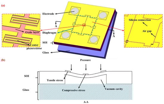 Schematic of the developed piezoresistive pressure sensor with optimized positions of piezoresistors: (a) The piezoresistive pressure sensor comprises two sections: an SOI wafer with sensing elements and a glass cap for a hermetic package; (b) outside pressure deforms pressure-sensitive diaphragms, leading to the different stresses and corresponding resistance changes of the piezoresistors.