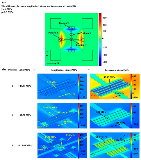 Numerical simulation of the surface stresses of the developed piezoresistive pressure sensor: (a) the absolute stress difference (ASD) of the proposed sensor with (b) the detailed distribution of longitudinal/transverse stresses inside the piezoresistors at positions 2, 3 and 4.