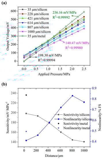 Figure 3b shows the sensitivity and linearity of the piezoresistive pressure sensor as a function of the applied pressure when the piezoresistors on the Y-centerline of the pressure-sensitive diaphragm were positioned at different distances from the center. More specifically, as the distance between two piezoresistors was increased from 35 to 1000 μm, output sensitivities were found to decrease from 198.30 to 140.47 mV/MPa, and nonlinearities were observed to increase from 0.41% FS to 0.77% FS. These results were consistent with the results showed in Figure 2b, which further indicated two piezoresistors should be positioned at the center of the pressure-sensitive diaphragm.