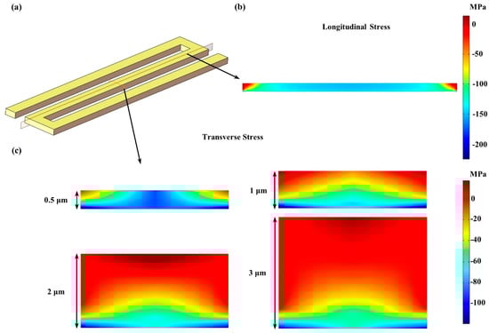 To further analyze the stress distribution and find the optimum thickness of piezoresistors, detailed analyses of longitudinal/transverse stresses were conducted inside the center piezoresistor, as shown in Figure 4a, with the corresponding longitudinal section and the transverse section appropriately marked.