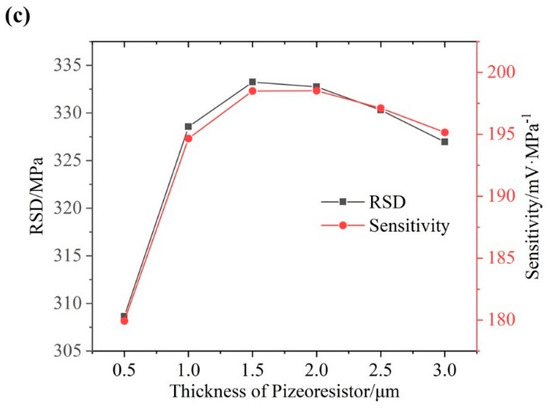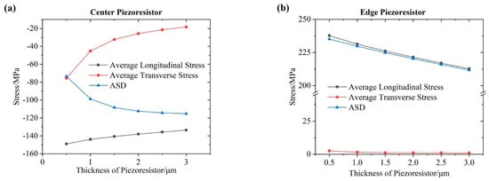 Figure 5a shows the average longitudinal/transverse stresses and ASD of the center piezoresistor as a function of the thickness. The longitudinal stress, which has two relatively small LSA at the edge, would increase approximately linearly with the expansion of LSA. On the contrary, the transverse stress, which was mostly occupied by a large LSA, showed a lower increasing trend as the thickness increased. The different ascent rates led to a decreasing trend of ASD, which meant that the center resistance change under certain pressures would increase with the increasing thickness of piezoresistor (the absolute value of ASD increased).