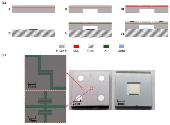 The SOI wafer was cleaned using piranha etchant (H2SO4:H2O2 = 5:1) to remove organic impurities (see Figure 6a(I)). Then, the vacuum cavity in the handle layer and the piezoresistors in the device layer of the SOI wafer were etched by deep reactive ion etching (DRIE) based on patterned AZ4903 and AZ1500 photoresist, respectively (see Figure 6a(II), (III)). Films of Ti with a thickness of 1 μm and Au with a thickness of 30 nm were evaporated on the BF33 glass wafer successively as getter materials (see Figure 6a(IV)), followed by anodic bonding to form the vacuum cavity (see Figure 6a(V)). In the end, four Al electrodes with a thickness of 1 μm were evaporated on the patterned device layer to form electrical connections (see Figure 6a(VI)).