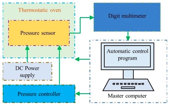 The characterization system of the fabricated piezoresistive pressure sensor mainly included a pressure controller (PPC4, DH Instruments, Everett, WA, USA, accuracy of 10 Pa), a thermostatic oven (SH 241, ESPEC, Osaka, Japan, accuracy of 0.5 °C) and a digit multimeter (KEITHLEY 2100, Tektronix, Beaverton, OR, USA, accuracy of 0.0038%), as shown in Figure 7.