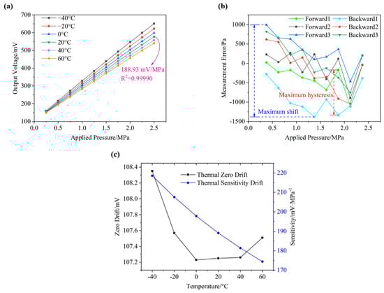 Figure 8a shows the output voltage of the fabricated piezoresistive pressure sensor under the functions of pressure and temperature variations. At a certain temperature, a linear correlation between the output voltage and applied pressure was found, which had a sensitivity of 218.18 mV/MPa and a R2 value (correlation coefficient) of 0.99979 at −40 °C, a sensitivity of 188.93 mV/MPa and a R2 value of 0.99990 at 20 °C and a sensitivity of 174.22 mV/MPa and a R2 value of 0.99993 at 60 °C.