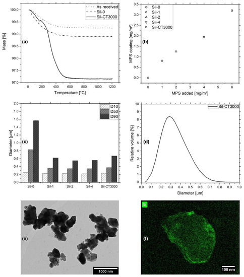 (a) TGA curves of CT3000 as received, Sil-0 and Sil-CT3000. (b) Total amount of MPS in the coating in dependency of the added MPS for Sil-0, Sil-1, Sil-2, Sil-4 and Sil-CT3000. (c) Particle diameters of Sil-0, Sil-1, Sil-2, Sil-4 and Sil-CT3000 expressed in D10, D50 and D90 values. (d) PSD of Sil-CT3000. (e) TEM image of Sil-CT3000. (f) TEM image of a Sil-CT3000 particle with an overlaid EDX signal of silicon.