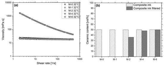 (a) Viscosity in dependency of the shear rate of M-0, M-1, M-2, M-4, M-6 at a temperature of 32 °C. (b) Ceramic content of the materials before and after filtration.