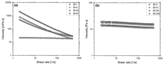 Viscosity of the filtered inks (a) M-I to M-IV and (b) M-V to M-VIII after filtration in dependency of the shear rate at a temperature of 32 °C.