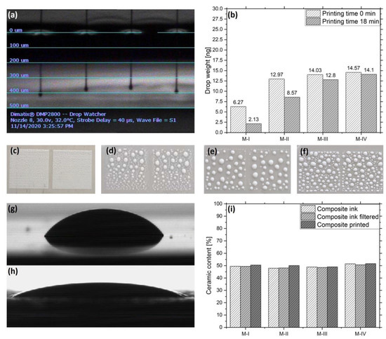 On the contrary, M-III and M-IV do not indicate significant weight changes, which means that the nozzles stay functional for a longer time. Figure 4c–f demonstrates the deposition of the four materials with a drop spacing of 20 µm onto a PDMS coated aluminum substrate. For M-I, the image indicates good wetting with a homogeneous covering of the substrate, which is caused by their comparatively low surface tensions of 16.1 mN/m relative to the surface energy of PDMS, which is 21.0 mJ/m2. The deposition of M-II, M-III and M-IV leads to large drop formations due to their high surface tensions of 27.9 mN/m, 30.1 mN/m and 31.7 mN/m, respectively. To improve the wetting, 10 layers were printed with a drop spacing of 40 µm to form a composite film with a surface energy of 34.4 mJ/m2, which allowed for significantly better surface coverage. The difference is illustrated in Figure 4g,h, where, at first, a drop of M-IV is deposited on PDMS, having a contact angle of 57.4°, and the same drop is then placed onto the composite film, which leads to a lower contact angle of 29.1°. Figure 4i displays the ceramic content of the materials before and after filtering, as well as after printing. It shows that during the processing of the materials no relevant amounts of ceramic were lost, which demonstrates the good stabilization of the particles inside the inks.