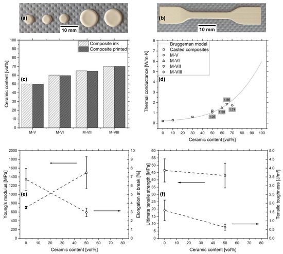 (a) Specimens for the thermal conductance measurement and (b) for the tensile test. (c) Ceramic content of the M-V to M-VIII inks and printed composites. (d) Thermal conductance of the casted composites and of M-V to M-VIII in dependency of the ceramic content complemented by the Bruggeman model. (e) Tensile modulus and elongation at break in dependency of the ceramic content. (f) Ultimate tensile strength and tensile toughness in dependency of the ceramic content.