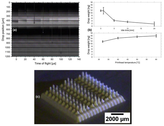 The ink M-V was further characterized regarding its 3D inkjet properties. Therefore, the nature of the ink drop flight and morphology was investigated. The drop position is shown as function of time during the ejection from the nozzle in Figure 6a. The drop velocity is 11 m/s, which, according to theory, is beneficial and will not result in splashing upon impact of the drop onto the substrate. The Weber, Reynolds and Ohnesorge numbers support this finding. Their values are 159.2, 20.8 and 0.6, respectively. In the idle state of the printhead, however, an increasing occlusion of the nozzles is observable with time. It noticeably sets in after 5 min, as Figure 6b exhibits. A cleaning cycle repeated in short consecutive intervals may prevent this negative effect. Heating of the nozzles beyond 32 °C, which also serves as risk for increasing evaporation and occlusion, does not lead to a reduction of the ejected material. Instead, more material passes through the nozzles at temperatures of up to 60 °C, as can be seen in Figure 6b, the explanation of which could be the reduction of ink viscosity. This finding was utilized to improve the jetting stability during the 3D inkjet printing of a demonstrator, which is shown in Figure 6c. The structure is a rectangular platform with an area of 10 mm2 and a total height of roughly 2 mm. The columns were intended to be cylindrical with a radius of 0.5 mm. Yet, the result indicates that the printing process was not precise enough to achieve the structures. Among others, a possible explanation is the misalignment during the retrieval and reinstallment of the demonstrator for solvent evaporation. In addition, the resulting column height is heterogeneous, which hints at a possible partial occlusion of some of the nozzles while the printer was idle, which were not recanalized during consecutive printing steps.