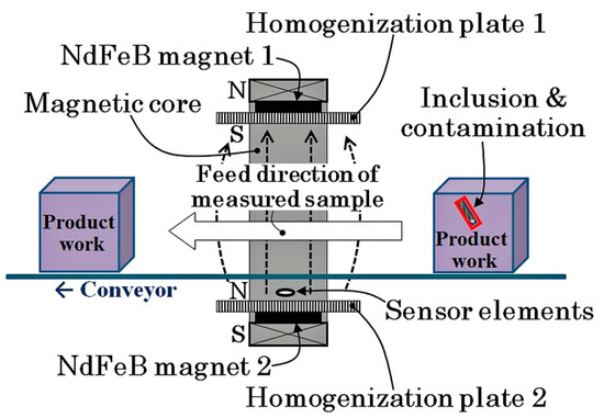 Figure 1 shows a schematic explanation of the concept at the basis of the measurement system. The system was set on a feeding conveyer of workpiece and could nondestructively detect the presence of contaminants and estimate their position and size. This proposed system can realize a full inspection of a non-magnetic metal workpiece for the detection of magnetic contaminant chipping.