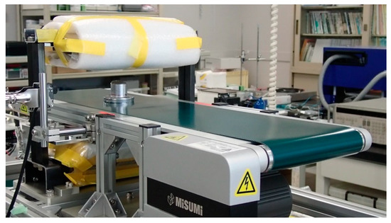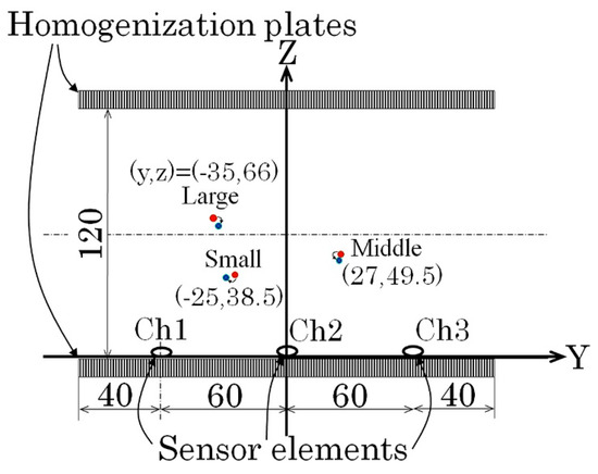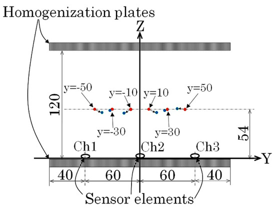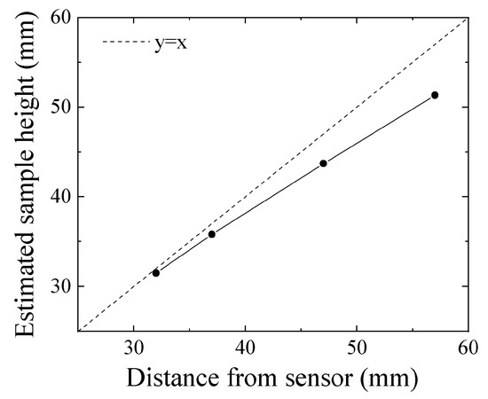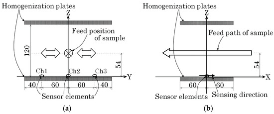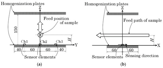 Figure 14 is a schematic explanation of the measurement layout for the first experiment. Figure 14a shows a front view and Figure 14b shows a side view of the layout. The front view is shown from the viewpoint of the feeding sample. The sample was fed at constant velocity, 100 mm/s, along the X-axis just above the middle sensor of the installed three sensors. In this case, the sample height H was the parameter to be estimated.