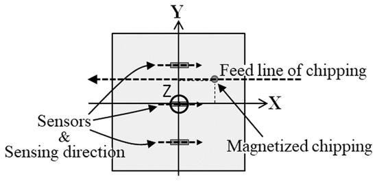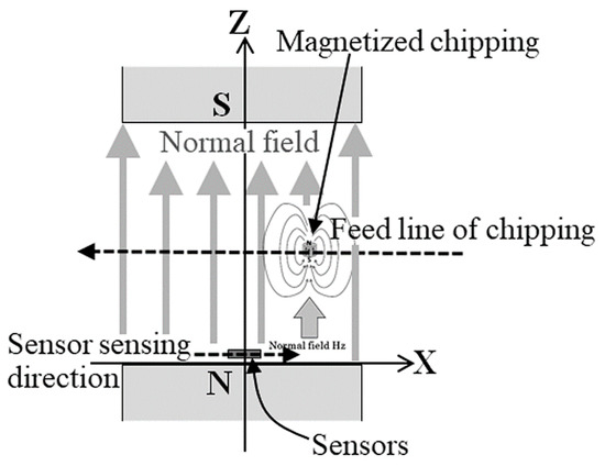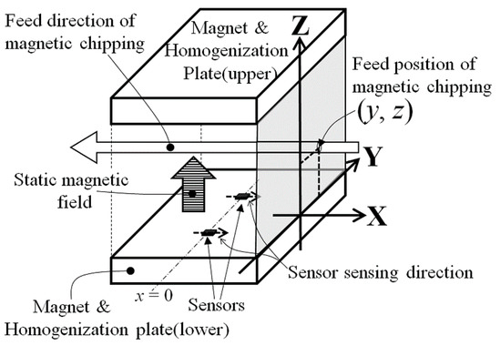 In this transformation, both m = (0, 0, mz) and the constants (y, z) were assumed to be subjected to the directional limitation of the measurement system, in which soft magnetic chipping was fed parallel to the X-axis within the magnetic field, which had a vertical direction. The reason why the component of the estimated magnetic field was only in present on the X-axis was linked to the sensing direction of the sensor installed in the vertical magnetic field, as shown in Figure 4.