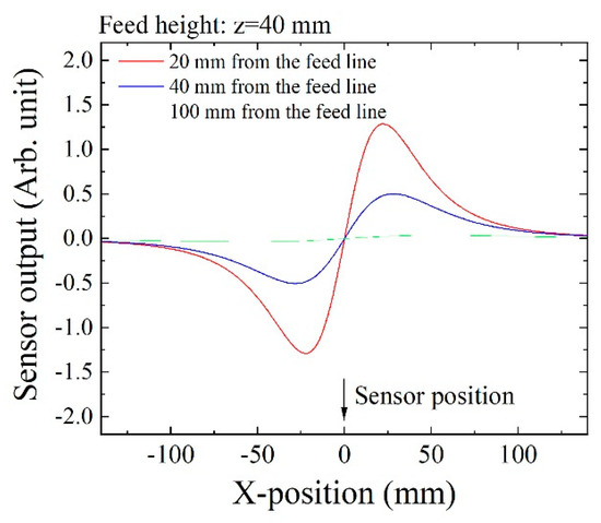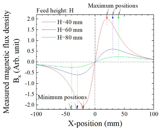 Figure 15 is a numerically simulated variation of Bx on the sensor position as a function of X. The magnetic dipole passed just above the sensor at the origin. Two extreme points appeared symmetrically with respect to the zero-crossing point, one was the maximum point, and the other was the minimum point. The extreme position XS1 was derived using Equation (9) and two extreme points. In the case in which the dipole was running through just above the sensor, the height was estimated as H = 2 × XS1 based on Equation (8). This Equation also indicated that the feeding height H equaled the distance between two extreme points, which was between the maximum and the minimum points.