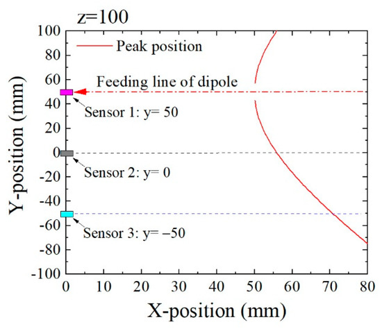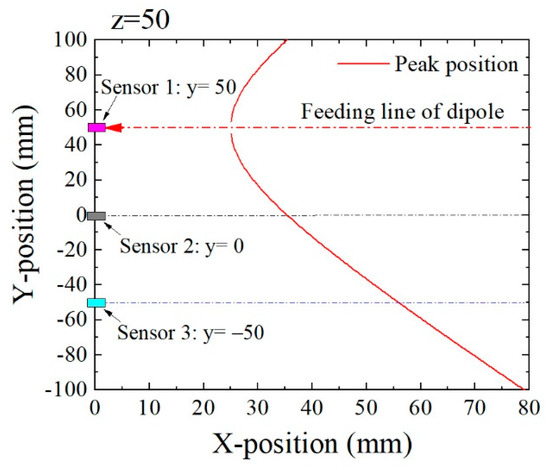 Figure 8 is the analogous estimation of the extreme point when the feeding line passed the point (y, z) = (50, 100), which was 50 mm higher than the feeding line, as shown in Figure 7. In this case, the extreme point appeared at higher value of x compared with its position in Figure 7. From these figures, it is expected to estimate the feeding position (y, z) based on the dimensions of extreme points obtained by several sensors.